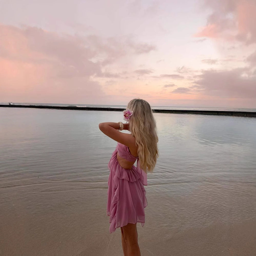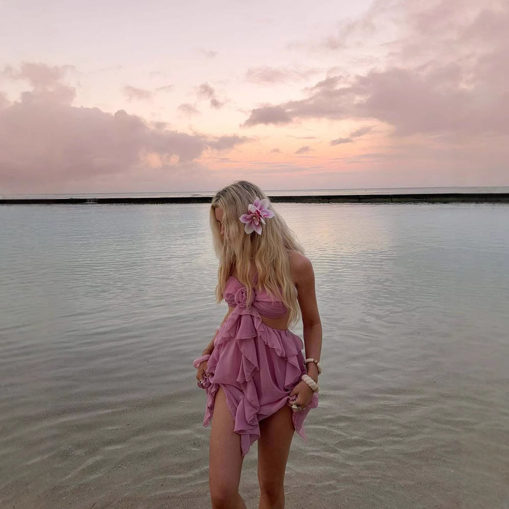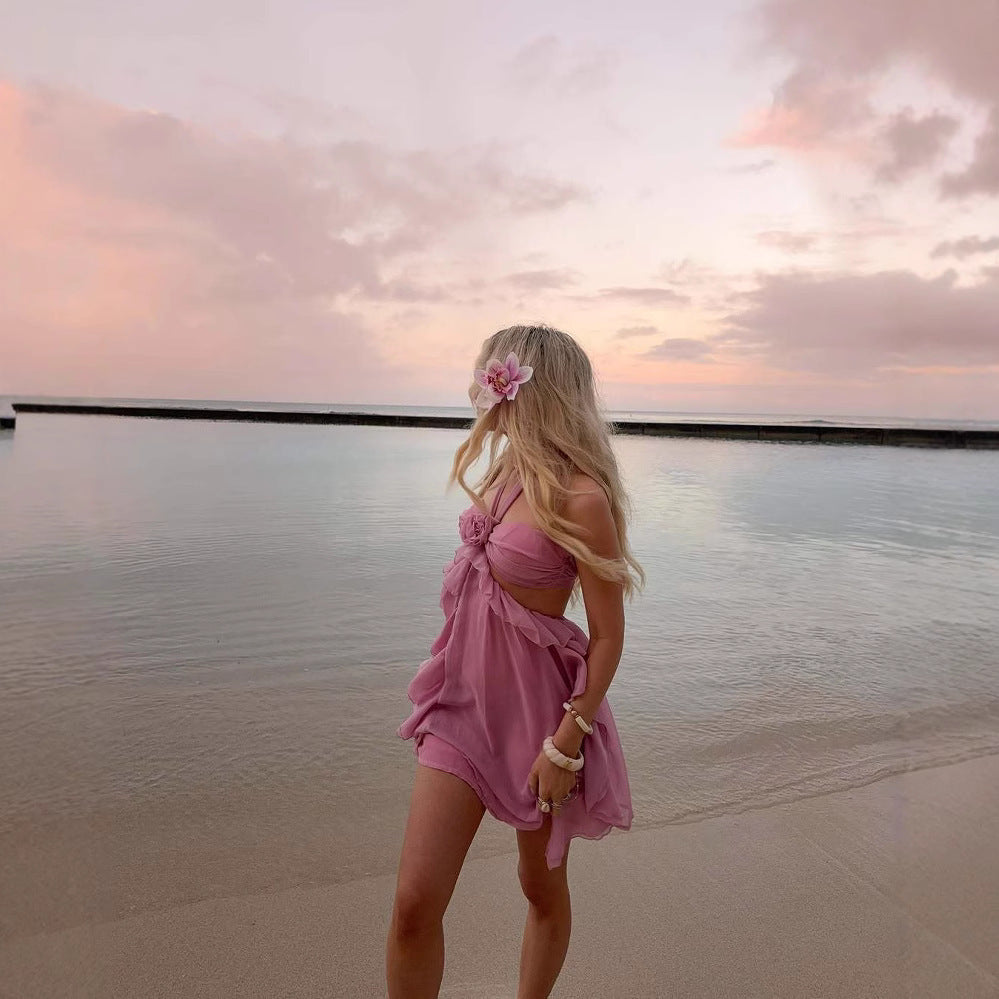Dans un souffle de mousseline rosée, votre silhouette danse au gré du vent. Cette création aérienne épouse vos formes avec une grâce infinie, révélant subtilement votre peau pour une allure divinement romantique. Vous ne portez pas simplement une robe, vous incarnez la poésie d'un soir d'été.