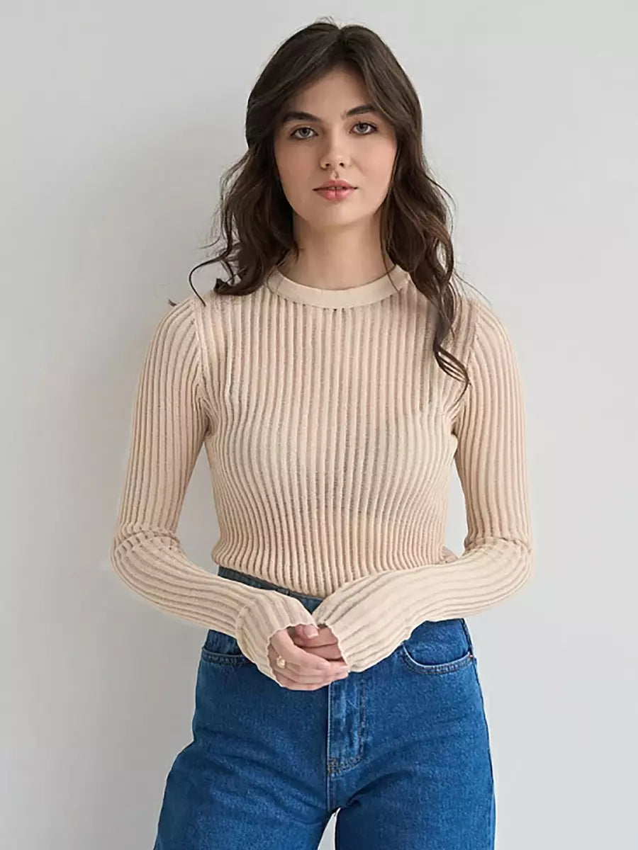 Laissez votre féminité s'exprimer avec ce haut qui épouse vos formes tel un voile délicat. Sa maille finement côtelée joue avec une subtile transparence, créant une allure sensuelle et raffinée. Vous vous sentez simplement chic, une base parfaite pour superposer ou briller seule.